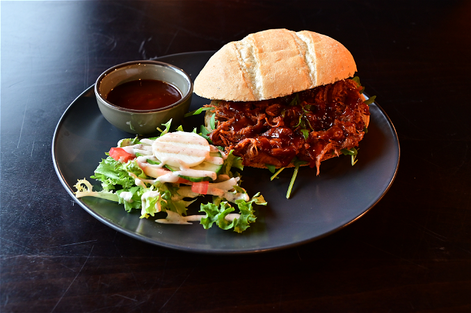 Gebakken pulled pork met knapperige rucola en barbecuesaus.