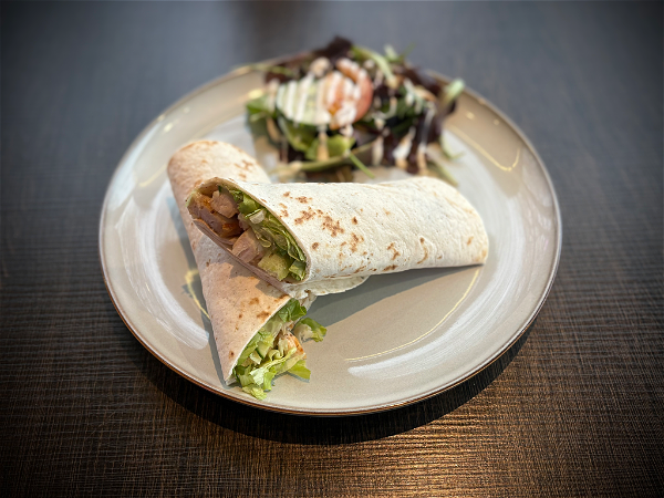 Knapperige rucola, low and slow smoked pulled chicken, bieslook en sweet chili saus.